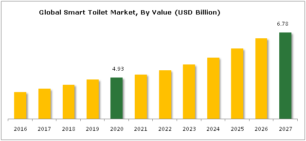 The global smart toilet market is estimated to grow by 5.0% and generate revenues of $6.78 billion by the end of 2027. The leading players in the market include Lixil Group Corporation, DXV, American Standard, Geberit AG, ROCA Sanitario SA, Caroma Industries Limited, Toto Ltd., Ove Decors and Villeroy.